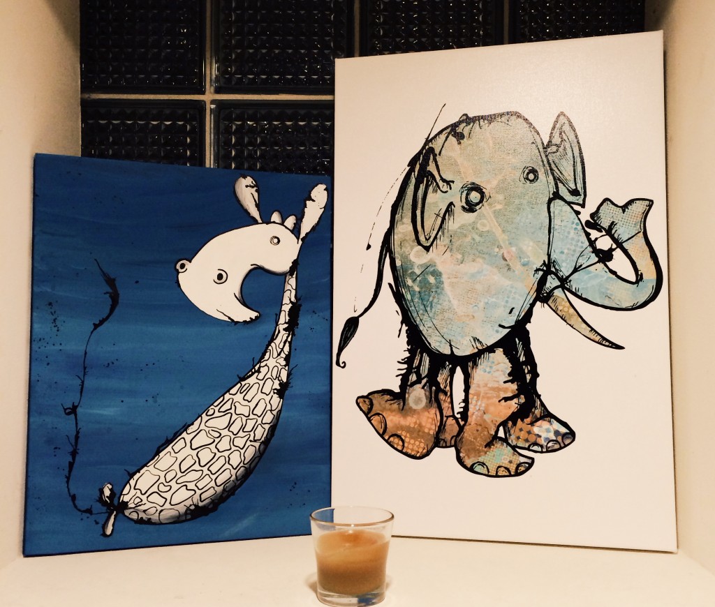 Caleb has the elephant hanging in the living room and a the giraffe displayed in the kitchen.